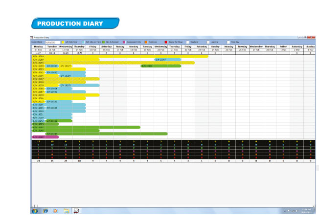 Calendar style planner shows all jobs currently being worked on and future jobs booked in. Different colours highlight if job has been assessed, assessment only, not authorised or total loss. The user can assign a loan car to any job. This screen also shows totals for each day, both number of cars and number of hours sold on each day.